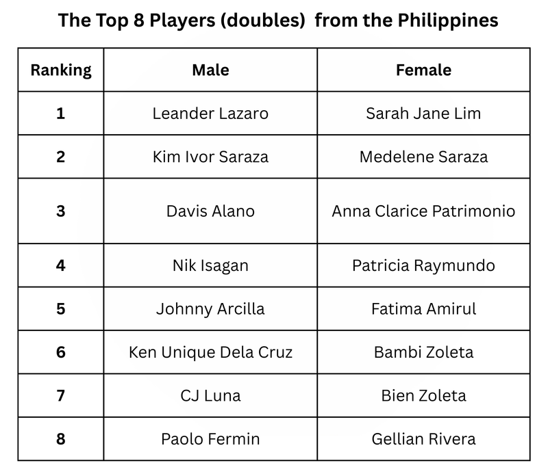 • A club may include only one Top 8 Male and only one Top 8 Female players in the Philippines